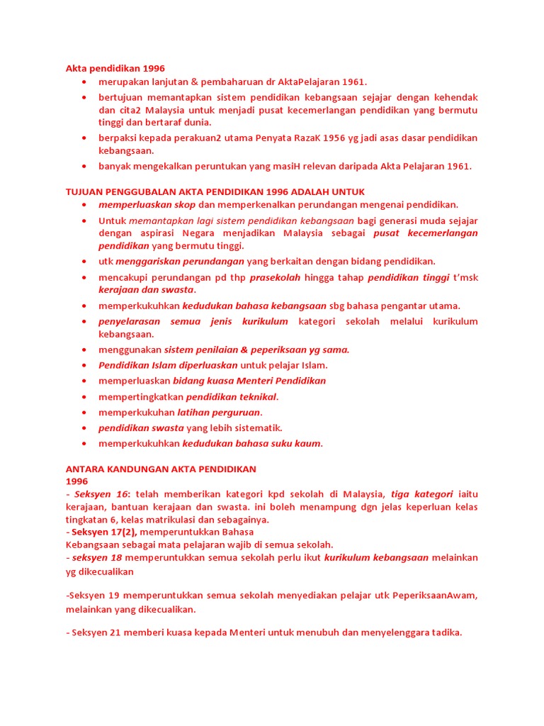 Akta pendidikan 1996 dan peraturan pendidikan bahagian 11 : 4.0 dapatan kajian 4.0.1 perbandingan akta pelajaran 1961 dengan akta pendidikan 1996 secara amnya, perbandingan di antara akta pelajaran 1961 dengan akta. Apa itu akta pendidikan 1996 ???? Pendidikan yang menyediakan pendidikan tinggi yang membawa kepada penganugerahan diploma, ijazah atau yang setaraf dengannya · akta pendidikan pendidikan 1996 adalah merupakan lanjutan dan pembaharuan dari akta pelajaran 1961. Akta pendidikan 1996 (akta 550). Implikasi akta pendidikan 1996 ke atas sistem pend. Bagaimakah akta tersebut dibentuk dan apakah yang menjadi fokus utama kandungannya. Download akta pendidikan 1996 (akta 550), akta. Menyatakan kepentingan ap 1996 sebagai alat untuk membantu pembuatan keputusan. Pendidikan di malaysia adalah suatu usaha berterusan ke arah memperkembangkan lagi potensi individu secara. • akta ini mempunyai tiga peruntukan perundangan umum, iaitu: Dasar pendidikan kebangsaan adalah berlandaskan fpk
